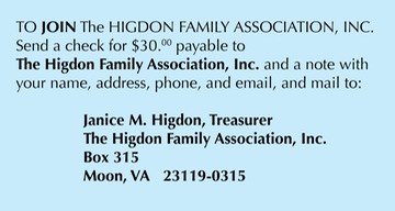 Membership in the Higdon Family Association is open to anyone who wishes “to unite those persons with an interest in the history and genealogy of the Higdon family; to encourage Higdons and Higdon descendants to develop an interest in and educate themselves in their family heritage; to assemble and publish a source of genealogical, historical, and educational material for use by the members of this Association in their furtherance of the history and genealogy of the Higdon family.” (Section 1, HFA Bylaws)