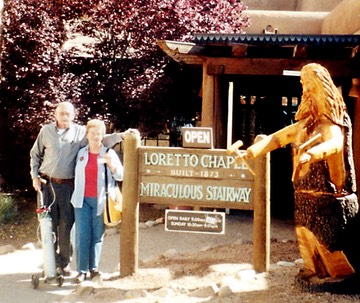 The HFA meeting in Albuquerque was just fabulous. The events included a day trip to Santa Fe. Almost everyone took time to visit the Loretto Chapel to see the staircase, which you just need to see to appreciate. The staircase contains two 360 degree turns yet there are no side or center supports. Below, Eugene and Georgetta Smith are shown just outside the chapel.