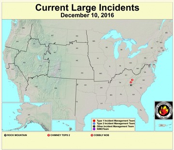The current death toll in the recent Gatlinburg fires is now 14. Two people have been arrested for deliberately setting the Gatlinburg fires.The U.S. Forest Service reports that only 3 large fires are still burning in the US, all in the Southeast, at the southern end of the Appalachian Mts.