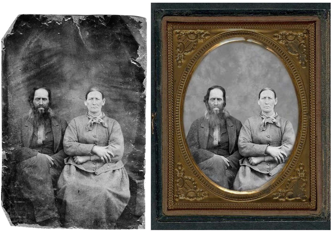 Below, in the thumbnail 10 image display sequence, please find in the first image display a photo of Leonard Higdon & Mary Ann McClure that was used for two decades by the Higdon Family Association Website. The second image display in the sequence is a side-by-side comparison of lo-res and hi-res scans of a single image captured before the first image. What you see after the first two sequence display images are photos highlighting several different steps in the post-processing of the second image of the sequence, using a low resolution and a high resolution scan. This second image displayed in the thumbnail sequence was captured with a specialized tintype camera back when Leonard & Mary Ann were at age somewhere in their 40s and in some type of portable studio setting. In the remaining sequence image displays, you see 9 distinct points in the photo retouching process. There were many, many more action points. However, these 9 points plus the final restored image give you an excellent overview of the repair & restore process.
